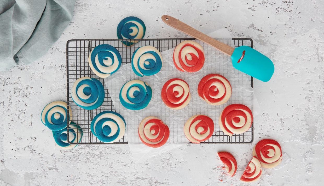 While the red and white cookies are cooling, repeat the above steps with the remaining blue and white dough.