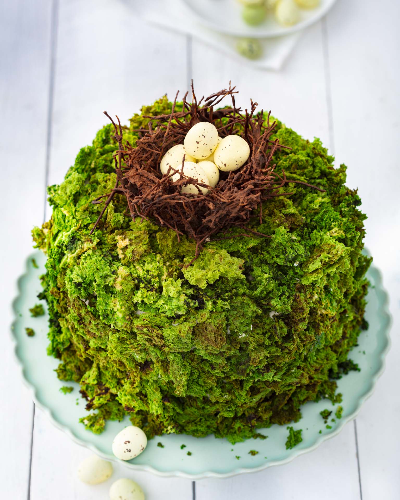 Carefully remove the nest from the foil and place on top of the moss cake. Fill with Easter eggs.