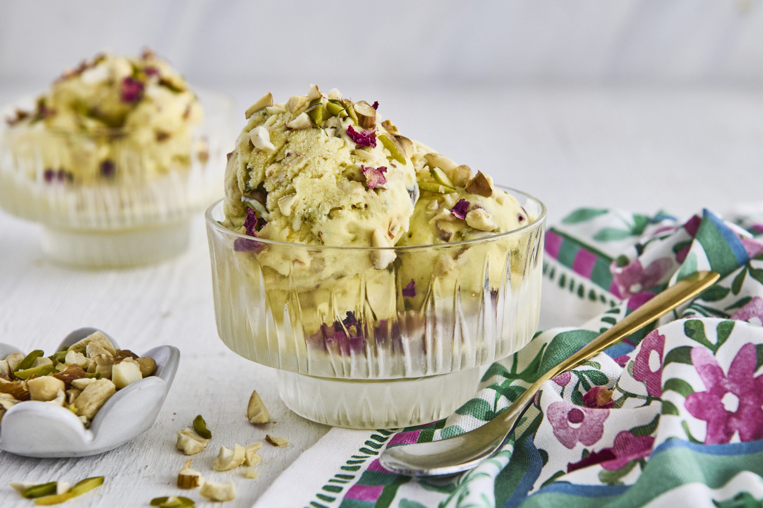 Remove the ice cream from the freezer 20 mins before you are ready to serve to thaw slightly, then sprinkle with the remaining 1/4 cup chopped nuts and dried rose petals (if using) and serve.