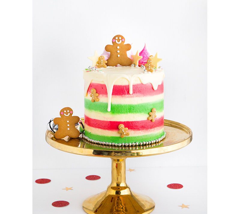 Pour desiccated coconut and ground pistachios onto a large shallow dish and set aside. When ready to assemble, chill cake in fridge for 15mins to firm it up and make it easier to handle. Use a 10x6cm tree shaped cookie cutter to cut 12-14 tree shapes from the vanilla cake.