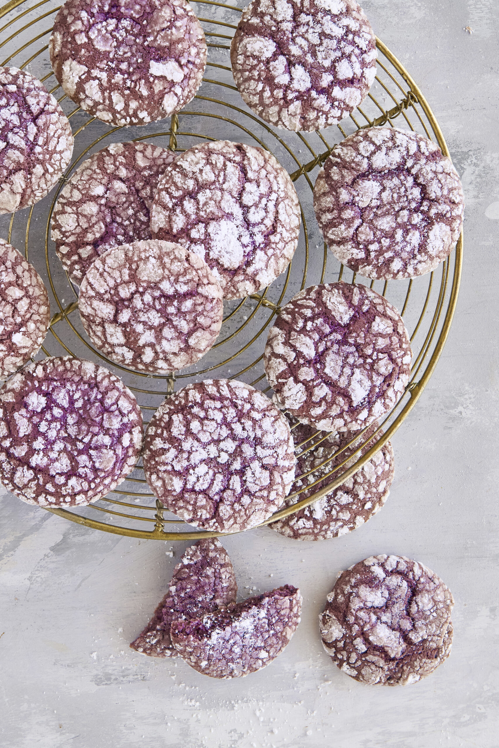 Working quickly with damp hands, roll a tablespoon sized piece of dough into a round ball and coat liberally in icing sugar. Place on your cookie sheet and repeat with remaining dough ensuring the dough is placed 3-4cm apart. Bake for 8-10 minutes until the cookies have spread and cracked on top and are no longer glossy. Remove from oven and set aside to cool on pan for 5 minutes to set enough to handle before transferring to a cooling
