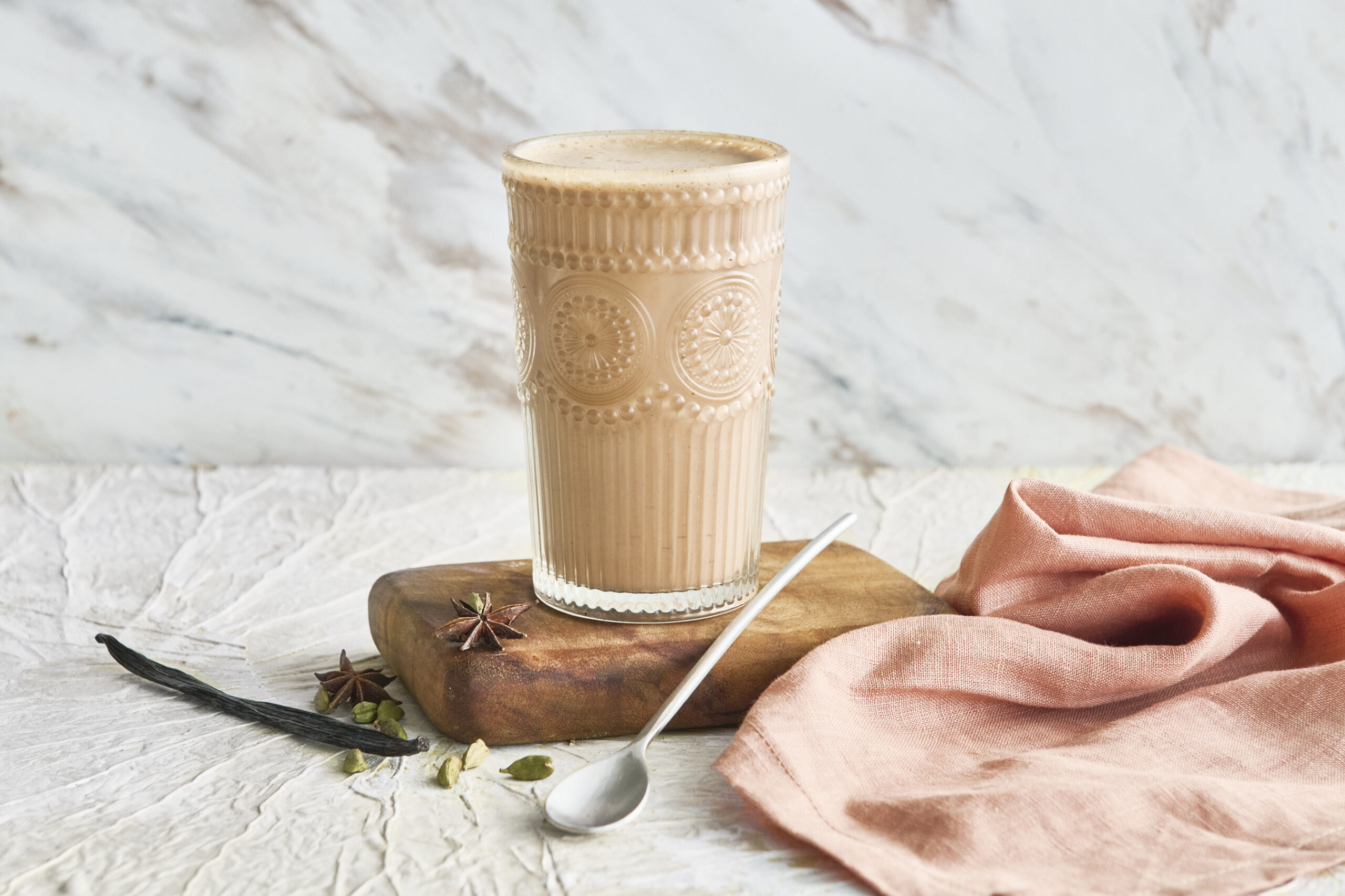 In a mortar and pestle (or using a wooden chopping board and the hilt of a heavy knife), crush the cardamom pods, star anise and peppercorns. Add the crushed spices to a small saucepan with 1 cup water, ginger, cinnamon, vanilla bean and its seeds. Heat over medium-low heat until it is simmering then cover and simmer for a further 10 minutes.